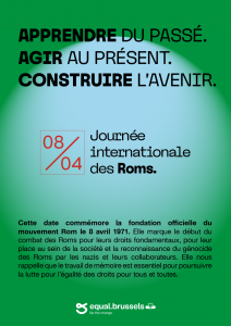 Cette date commémore la fondation officielle du mouvement Rom le 8 avril 1971. Elle marque le début du combat des Roms pour leurs droits fondamentaux, pour leur place au sein de la société et la reconnaissance du génocide des Roms par les nazis et leurs collaborateurs. Elle nous rappelle que le travail de mémoire est essentiel pour poursuivre la lutte pour l’égalité des droits pour tous et toutes.